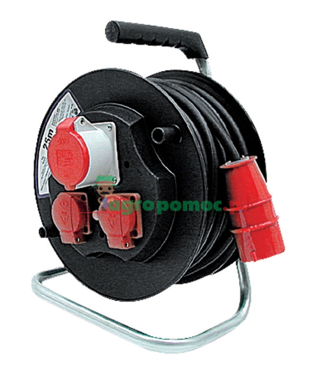 400 V, z certyfikatem CCE, długość = 25 m, bęben wykonany z bardzo wytrzymałego tworzywa, odpowiada normom VDE-CCE. z 3-pinowym wyłącznikiem bezpieczeństwa, 3 gniazda wtykowe: 2 gniazda wtykowe ze stykiem ochronnym 230 V z klapką ochronną, 1 gniazdo wtykowe CEE, 5-pinowe, 400 V 16 A