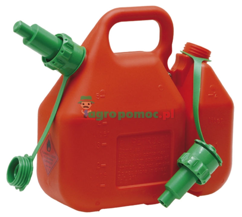 - 5 l mieszanki paliwa - 2 l oleju łańcuchowego - dopuszczenie UN/BAM - wzmocniona wersja - kolor pomarańczowy/zielony - system wlewowy do paliwa - rurka do oleju