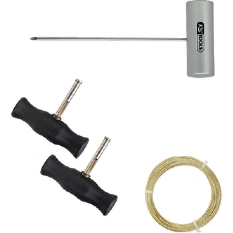 1 x Draht-Durchstoßsonde mit T-Griff1 x Zuggriff-Satz für Scheibendraht1 x KFZ Scheiben-Schneiddraht gewickelt, gold, 22,5 Meter