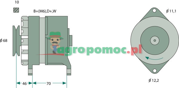 K1 14V 23/55A 14V 55A z kołem pasowym B+ (M6), D+ oraz W = przyłącze wtykowe