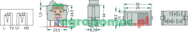 3 funkcje,7 przyłączy wtykowychwymiary montażowe: 15 mm szerokości, 29 mm długości i 34 mm wysokości z płaskim przyłączem wtykowym