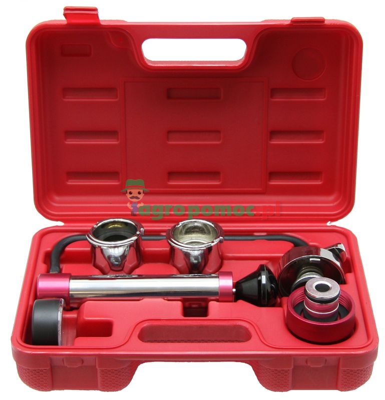 Do kontroli szczelności układu chłodzenia, ustalenia miejsca nieszczelności. Z manometrem, pompą ręczną z przyłączem 2" i 3 powszechnie stosowanymi adapterami. Cały zestaw w skrzynce z tworzywa.