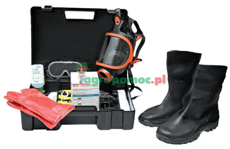 skrzynka z tworzywa ok. 425 x 315 x 160 mmzawartość: rękawice z PVC PVCpłuczka do oczuokulary ochronnekombinezonobuwie ochronnemaskafiltr