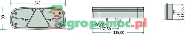 Lampa pozycyjna tylna, hamowania, kierunkowskaz, światło jazdy wstecznej, przeciwgmielne i trójkątny odblask.Mocowania lamp amortyzowane pojedynczo, montaż pionowy lub poziomy. Z wstępnie kablowanym 7-pinpwym centralnym prz