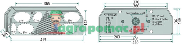 2x lampa pozycyjna tylna i hamowania, kierunkowskaz, światło cofania, przeciwmgielne, boczne, gabarytowe i trójkątny odblask. Amortyzowane mocowanie lampy, montaż poziomy, z wstępnie okablowanym 7-pinowym centralnym przyłączem wtykowym płaskim. ADR strefa 2, IP54, dopuszczona do ruchu drogowego.