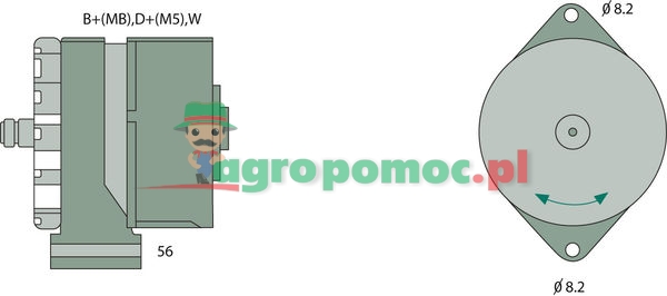 K1 14V 30/85A 14V 85A bez koła pasowego B+ (M8), D+ (M5), W=przyłącze wtykowe